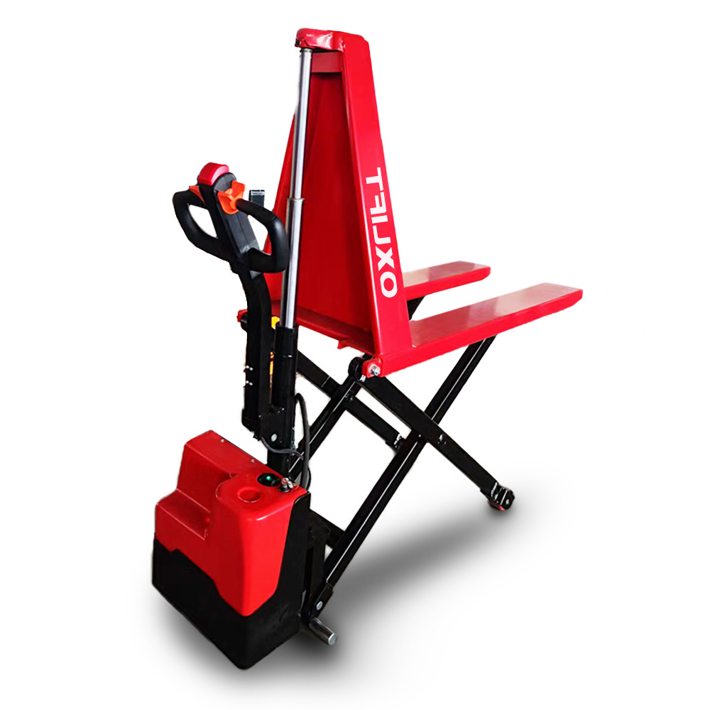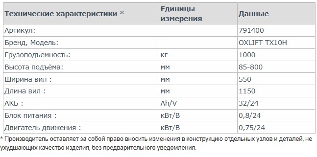 Модель TX10H – транспортировщик паллет (электрическая рохля) с ножничным подъемом, электрическими двигателями подъема и движения по горизонтали, способная поднимать и перемещать грузы весом до 1 тонны. Максимальная высота подъема – 800 мм, минимальная высота подъема – 85 мм, подходит для европаллет. С точки зрения производительности, TX 10H имеет привод мощностью 0,75 кВт и подъемный двигатель мощностью 0,8 кВт и оснащен аккумулятором 24 В 32 А/ч.