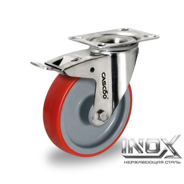Колесо CASCOO поворотное с тормозом из нержавейки (d=125мм, г/п=200кг), полиуретан / полиамид, Германия