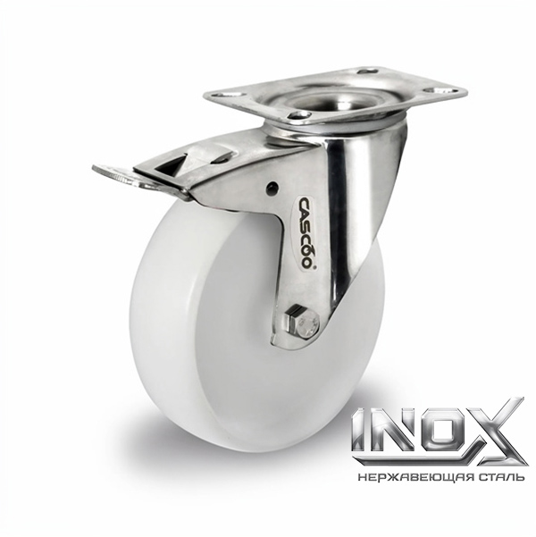 Колесо CASCOO поворотное с тормозом из нержавейки (d=80мм, г/п=130кг), полиамид, Германия