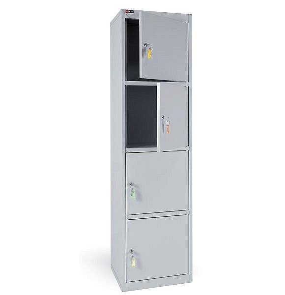 Шкаф на 4 ячейки. Петли на дверце шкафа внутренние. Размер ячейки подходит для вертикального хранения документов формата А4 в папках различного типа.