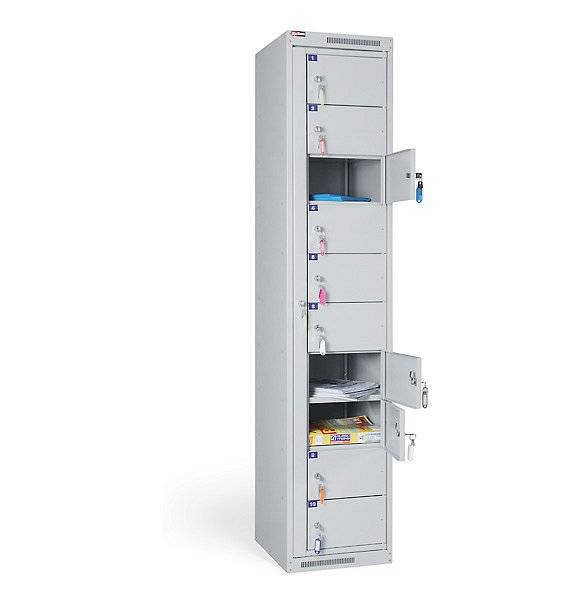 Шкаф на 10 ячеек. Изготавливается в двух вариантах: сборный и разборный. Собирается с помощью заклепочника. Ячейки пронумерованы. Каждая ячейка открывается отдельным замком «EURO-LOCKS». Шкаф укомплектован бирками для ключей.