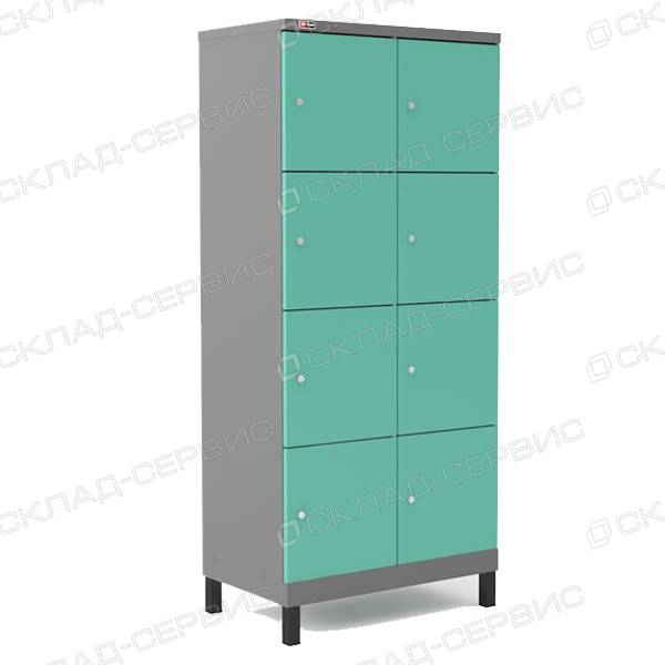 Готовый комплект шкафа-локера, 2 секции, с четырьмя отделениями в каждой секции. Ширина секции — 300 мм. Шкаф установлен на четыре ножки.