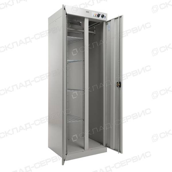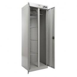 Мощность нагревательных элементов 2500 Вт и производительность вентилятора 180 м3/час позволяет просушить не просто влажные, но и очень мокрые вещи, а за счет хорошей циркуляции воздуха сокращается время сушки. Глубина шкафа 600 мм позволяет сушить объёмные вещи, в том числе спецовки и зимние куртки. Четыре полки и перекладина для вешалок входящие в комплект к шкафу позволяют сушить не только верхнюю одежду, но и перчатки, варежки, носки и т.д. К тому же, шкаф можно присоединить к системе вытяжной вентиляции при помощи фланца диаметром 125 мм входящем в комплект.