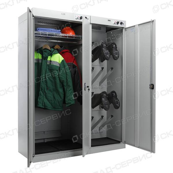 Шкаф состоит из двух секций одна из которых предназначена для сушки одежды а другая для сушки обуви. Отсек для сушки спецодежды содержит в себе перекладину для вешалок и полку для сушки головных уборов. Перекладина для одежды способна выдерживать нагрузки до 50 кг, а передвижная полка для касок и перчаток - до 10 кг. Секция для обуви, оснащена специальными держателями (патрубками) для развешивания обуви, через которые поступает поток воздуха. Инерционный клапан на каждом патрубке перекрывает подачу воздуха, если обувь не надета.