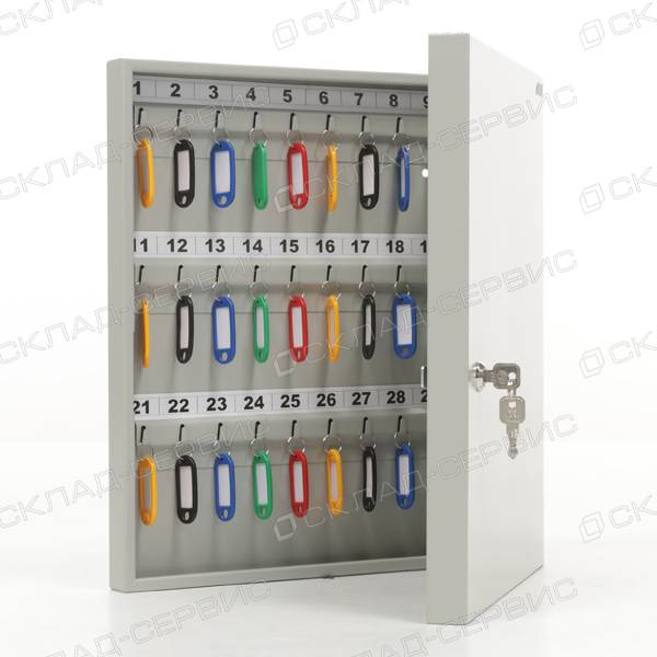 Ключница KEY-60 предназначена для хранения 60 ключей. Изготавливаются из стали толщиной 0,9 мм и окрашиваются в серый полуматовый цвет RAL 7038. Для крепления ключницы к стене предусмотрены отверстия на задней стенке корпуса. В комплект ключниц входят пластиковые цветные брелоки, рассчитанные на количество ключей и самоклеящиеся номерки. Закрывается на ключевой замок.