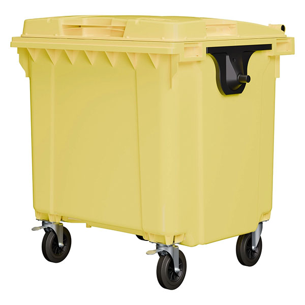 Вы можете заказать на sklad-21.ru мусорные желтые пластиковые контейнеры объемом 1100 литров с доставкой по РФ.