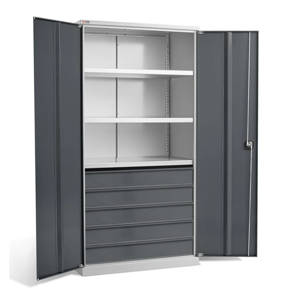 Шкаф укомплектован тремя оцинкованными полками и 5 выдвижными ящиками. Полки изготовлены из оцинкованного металла и регулируются по высоте с шагом 50 мм. Ящик оснащен качественными телескопическими направляющими полного выдвижения. В ящик можно установить пластиковые лотки или резиновый коврик.