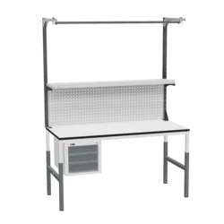 Регулировка высоты стола от 665 до 965 с шагом 30 мм (высота стола без экрана). Высота стола с экраном 1988-2288 мм. Все элементы надежно крепятся «на срез». Модульная конструкция, широкий выбор дополнительных аксессуаров. Столешница изготовлена из антистатического материала Thermopal (Германия) - ДСП, насыщенной графитом. Имеет ESD свойства. Подстолье - трубный металлический каркас, покрытый порошковой антистатической краской. Цвет опор стола, стоек экрана, ящиков тумбы - RAL 7012 (базальтово-серый), цвет экрана и корпуса тумбы - RAL 7035 (cветло-серый). Нагрузка на стол до 300 кг. В комплектацию стола входит одинарный экран для аксессуаров размерами 681х1535 мм ,полка ВС глубиной 300 мм, тумба инструментальная с 3 выдвижными ящиками, консоль с перекладиной-направляющей. Шаг перфорации экрана 35 мм. Поставляется в разобранном виде. Срок службы до 10 лет. Гарантийный срок - 3 года.