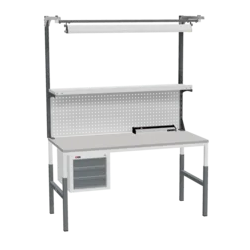 Регулировка высоты стола от 665 до 965 с шагом 30 мм (высота без экрана).Высота стола с экраном 1988-2288 мм. Все элементы надежно крепятся «на срез». Модульная конструкция — широкий выбор дополнительных аксессуаров. Столешница изготовлена из ДСП, покрытой оцинкованным листом. Имеет толщину 26 мм. Стол изготовлен в общепромышленном исполнении, не обладает ESD свойствами. Для сохранения антистатических свойств необходимо использовать ESD аксессуары. Подстолье - трубный металлический каркас, покрытый порошковой антистатической краской. Цвет опор стола, стоек экрана, ящиков тумбы - RAL 7012 (базальтово-серый), цвет экрана и корпуса тумбы - RAL 7035 (cветло-серый). Нагрузка на стол до 300 кг. В комплектацию стола входит экран для аксессуаров размерами 1263х1535 мм, тумба инструментальная с 3 выдвижными ящиками, полка ВС глубиной 300 мм, консоль с перекладиной-направляющей, электропанель и светильник. Шаг перфорации экрана 35 мм. Поставляется в разобранном виде. Срок службы до 10 лет. Гарантийный срок - 3 года.