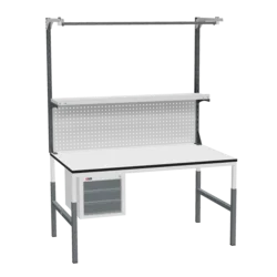 Регулировка высоты стола от 665 до 965 с шагом 30 мм (высота стола без экрана). Высота стола с экраном 1988-2288 мм. Все элементы надежно крепятся «на срез». Модульная конструкция, широкий выбор дополнительных аксессуаров. Столешница изготовлена из антистатического материала Thermopal (Германия) - ДСП, насыщенной графитом. Имеет ESD свойства. Подстолье - трубный металлический каркас, покрытый порошковой антистатической краской. Цвет опор стола, стоек экрана, ящиков тумбы - RAL 7012 (базальтово-серый), цвет экрана и корпуса тумбы - RAL 7035 (cветло-серый). Нагрузка на стол до 300 кг. В комплектацию стола входит одинарный экран для аксессуаров размерами 1263х1535 мм ,полка ВС глубиной 300 мм, тумба инструментальная с 3 выдвижными ящиками, консоль с перекладиной-направляющей. Шаг перфорации экрана 35 мм. Поставляется в разобранном виде. Срок службы до 10 лет. Гарантийный срок - 3 года.
