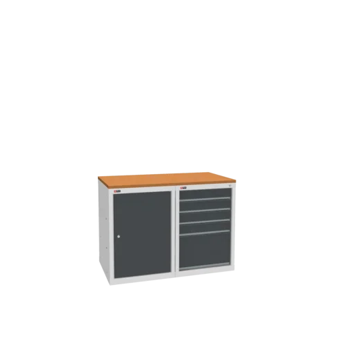 Тумбы ВЛ-К-015 и ВЛ-К-010, соединенные в тумбу-верстак. Сверху установлена общая столешница из фанеры 24 мм, обработанной и покрытой бесцветным лаком на основе воска. Тумба с дверцей укомплектована двумя полками. Тумба с ящиками содержит 5 ящиков на телескопических направляющих. Размеры ящиков 459х459 мм. Максимальная нагрузка на тумбу-верстак — 750 кг. Максимальная нагрузка на полку — 60 кг. Максимальная нагрузка на ящик— 30 кг. Корпуса тумб полностью сварные. Корпуса ящиков сварные. Тумба-верстак поставляется в разобранном виде.
