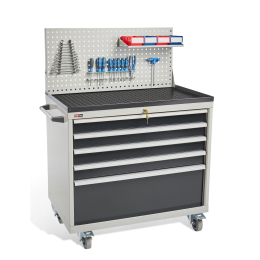 Инструментальная тумба ДиКом ВС-035 с 5 выдвижными ящиками, которые закрываются на один общий замок. Четыре ящика имеют высоту 100 (80) мм и один - 300 (280) мм. Тумба установлена на поворотные колеса диаметром 125 мм, два из которых с тормозом. Сверху тумбы установлен Лоток с маслобензостойким ковриком и перфорированный Экран. Для удобства перемещения на одну из боковых стенок установлена алюминиевая ручка с пластиковыми креплениями.