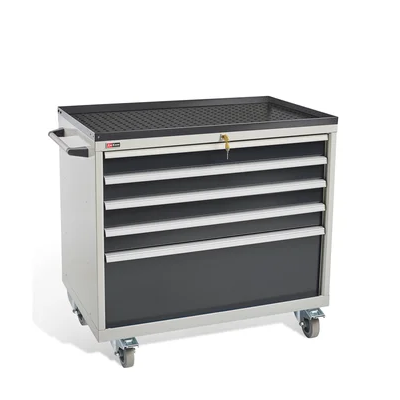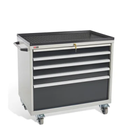 Инструментальная тумба ДиКом ВС-035 с 5 выдвижными ящиками, которые закрываются на один общий замок. Четыре ящика имеют высоту 100 (80) мм и один - 300 (280) мм. Тумба установлена на поворотные колеса диаметром 125 мм, два из которых с тормозом. Сверху тумбы установлен Лоток с маслобензостойким ковриком. Для удобства перемещения на одну из боковых стенок установлена алюминиевая ручка с пластиковыми креплениями.