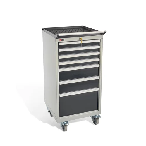 Инструментальная тумба ДиКом ВС-017 с 7 выдвижными ящиками, которые закрываются на один общий замок. Четыре ящика имеют высоту 75 мм ,два ящика высотой 150 мм и один ящик высотой 300 мм. Тумба установлена на поворотные колеса диаметром 125 мм, два из которых с тормозом. Сверху тумбы установлен Лоток с маслобензостойким ковриком. Для удобства перемещения на лоток спереди установлена алюминиевая ручка с пластиковыми креплениями.