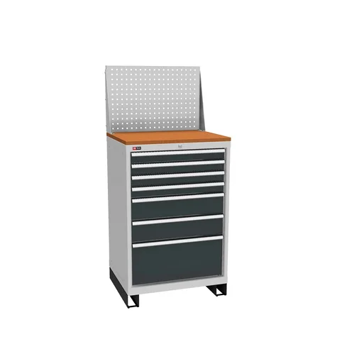 Инструментальная тумба ДиКом ВС-077 с 7 выдвижными ящиками, которые закрываются на один общий замок. Четыре ящика имеют высоту 75 мм, два - 150 мм и один - 300 мм. Сверху тумбы установлена Столешница из фанеры толщиной 24 мм и Экран под аксессуары. Фанера обработана и покрыта бесцветным лаком. Корпус тумбы и ящики полностью сварные, изготавливаются с применением роботизированных сварочных комплексов. Тумба установлена на подставку, которая позволяет перемещать тумбу с помощью погрузчика.