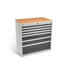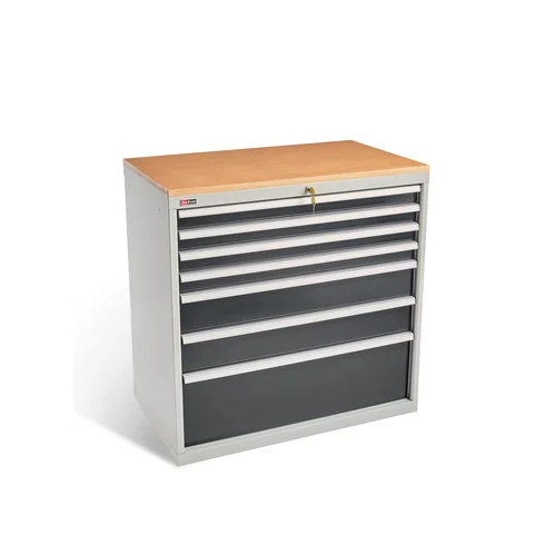 Инструментальная тумба ДиКом ВС-087 с 7 выдвижными ящиками, которые закрываются на один общий замок. Четыре ящика имеют высоту 75 мм, два - 150 и один - 300 мм. Корпус тумбы и ящики полностью сварные, изготавливаются с применением роботизированных сварочных комплексов. Сверху на тумбу установлена столешница из фанеры толщиной 24 мм. Фанера обработана и покрыта бесцветным лаком на основе воска.