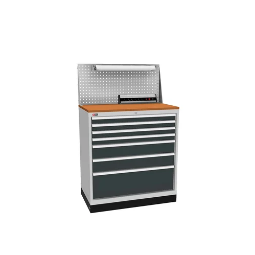 Инструментальная тумба с 7 выдвижными ящиками, которые закрываются на один общий замок. Четыре ящика имеют высоту 75 мм, два ящика - 150 мм и один - 300 мм. Укомплектована столешницей из фанеры 24 мм, экраном ,светильником и электропанелью, а также подставками с цоколем. Максимальная нагрузка на ящик — 100 кг. Сварной корпус тумбы и корпуса ящиков.