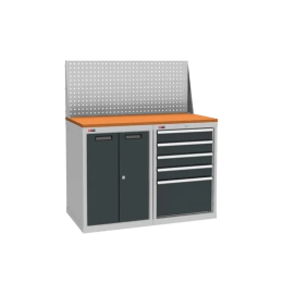 Тумбы ВC-015 и ВC-010, соединенные в тумбу-верстак. Сверху установлена общая столешница и экран под аксессуары. Столешница изготовлена из обработанной фанеры 24 мм, покрытой бесцветным лаком на основе воска. Экран с шагом перфорации 35 мм.
