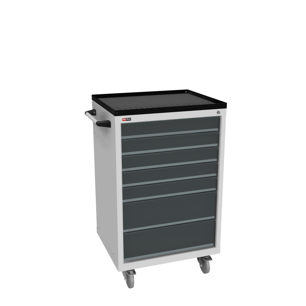 Инструментальная тумба с 7 ящиками: h100, h100, h100, h100, h100, h200, h200. Максимальная нагрузка на ящик — 60 кг. Телескопические направляющие. Тумба укомплектована колесами, лотком, боковой ручкой. Сварной корпус тумбы и корпус ящика. Общий замок, закрывает все ящики. Размер ящиков: 100х612х459 мм, 200х612х459 мм. Ящики на шариковых направляющих полного выдвижения позволяют комфортно работать с внутренним пространством тумбы. Все ящики утоплены внутрь габарита тумбы и не мешают в закрытом положении. Тумба установлена на поворотные колеса диаметром 125 мм, два из которых с тормозом.