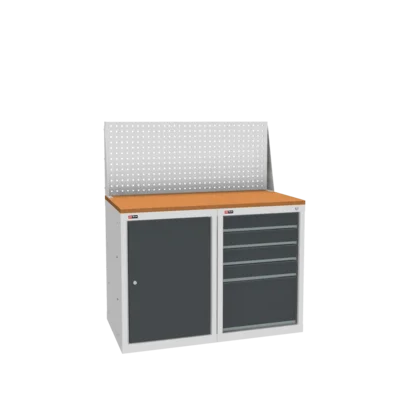 Тумбы ВЛ-015 и ВЛ-010, соединенные в тумбу-верстак. Сверху установлена общая столешница из фанеры толщиной 24 мм и Экран под аксессуары. Фанера обработана и покрыта бесцветным лаком на основе воска. Тумба с дверцей укомплектована двумя полками.