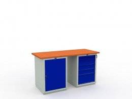 Верстаки окрашенны порошковой краской: корпус в серый полуматовый цвет (RAL 7038), лицевая панель ящиков, дверцы тумбы и экраны – синий (RAL 5002).