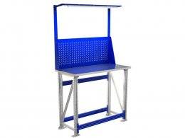 Основные элементы верстака (опоры, полка, подпятники, накладка на столешницу) изготовлены из оцинкованной стали, что позволяет устанавливать его в местах с повышенной влажностью.