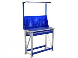 Так же верстак оборудован одинарным экраном с перфорацией, шаг перфорации составляет 38 мм. На экран можно повесить различные аксессуары: полки, держатели инструмента и т. д.