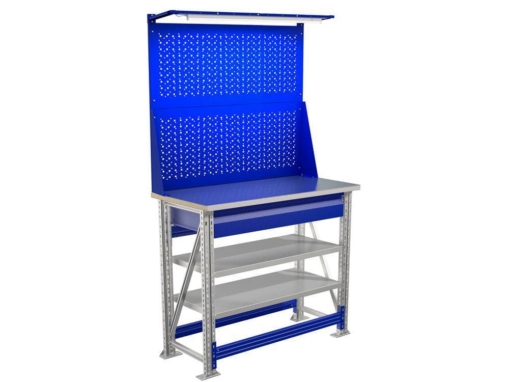 Так же верстак оборудован двойным экраном с перфорацией, шаг перфорации составляет 38 мм. На экран можно повесить различные аксессуары: полки, держатели инструмента и т. д. На экран установлен комплект светодиодного освещения. Мощность 7 Вт; световой поток — 650 лм; цветовая температура — белый 4200К.
