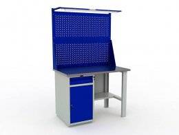 Верстак окрашен порошковой краской, цвет покрытия корпуса серый шагрень (RAL 7038), цвет лицевой панели ящика и дверцы и экрана - синий (RAL 5002).
