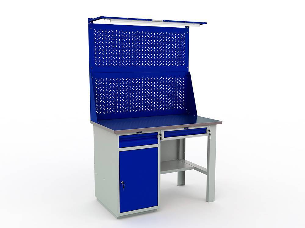Верстак окрашен порошковой краской, цвет покрытия корпуса серый шагрень (RAL 7038), цвет лицевой панели ящика и дверцы и экрана - синий (RAL 5002).
