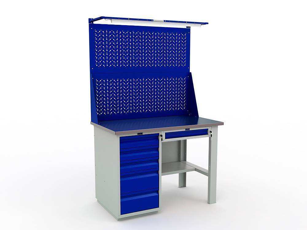 Верстак окрашен порошковой краской, цвет покрытия корпуса серый шагрень (RAL 7038), цвет лицевой панели ящика и экрана - синий (RAL 5002).