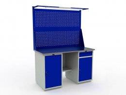 Верстак окрашен порошковой краской, цвет покрытия корпуса серый шагрень (RAL 7038), цвет лицевой панели ящика, дверцы тумбы и экрана - синий (RAL 5002).