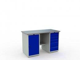 Верстак окрашен порошковой краской, цвет покрытия корпуса серый шагрень (RAL 7038), цвет лицевой панели ящика, дверцы тумбы - синий (RAL 5002).