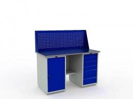 Верстак окрашен порошковой краской, цвет покрытия корпуса серый шагрень (RAL 7038), цвет лицевой панели ящика, дверцы тумбы и экрана - синий (RAL 5002).