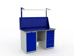 Верстак окрашен порошковой краской, цвет покрытия корпуса серый шагрень (RAL 7038),цвет лицевой панели ящика, дверцы тумбы и экрана - синий (RAL 5002).