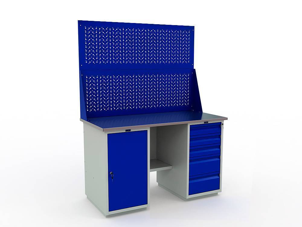 Верстак окрашен порошковой краской, цвет покрытия корпуса серый шагрень (RAL 7038), цвет лицевой панели ящика, дверцы тумбы и экрана - синий (RAL 5002).