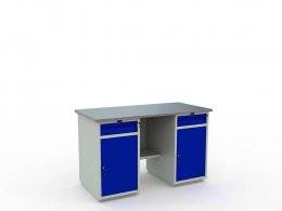 Верстак окрашен порошковой краской, цвет покрытия корпуса серый шагрень (RAL 7038), цвет лицевой панели ящика и дверцы - синий (RAL 5002).