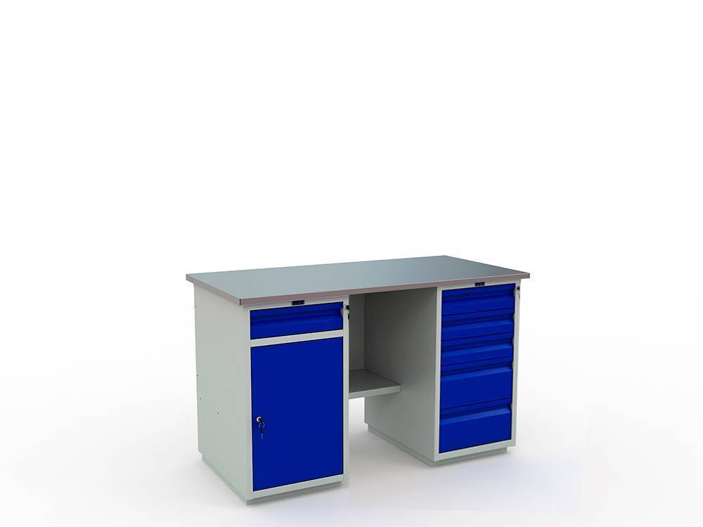 Верстак окрашен порошковой краской, цвет покрытия корпуса серый шагрень (RAL 7038), цвет лицевой панели ящика, дверцы тумбы - синий (RAL 5002).