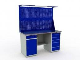 Верстак окрашен порошковой краской, цвет покрытия корпуса серый шагрень (RAL 7038), цвет лицевой панели ящика, дверцы тумбы и экрана - синий (RAL 5002).