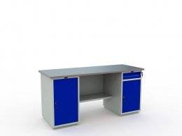 Верстак окрашен порошковой краской, цвет покрытия корпуса серый шагрень (RAL 7038), цвет лицевой панели ящика, дверцы тумбы - синий (RAL 5002).