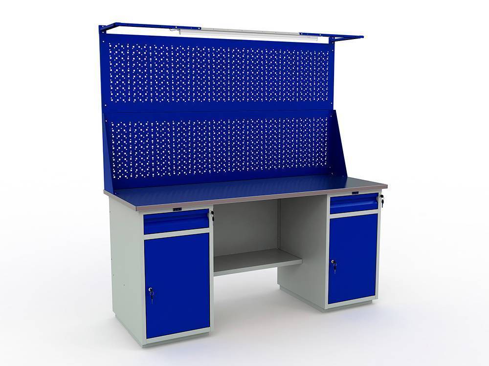 Верстак окрашен порошковой краской, цвет покрытия корпуса серый шагрень (RAL 7038), цвет лицевой панели ящика и дверцы и экрана - синий (RAL 5002).