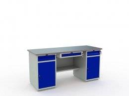 Верстак окрашен порошковой краской, цвет покрытия корпуса серый шагрень (RAL 7038), цвет лицевой панели ящика и дверцы - синий (RAL 5002).