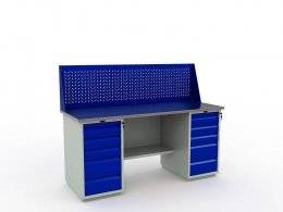 Верстак окрашен порошковой краской, цвет покрытия корпуса серый шагрень (RAL 7038), цвет лицевой панели ящика и экрана - синий (RAL 5002).