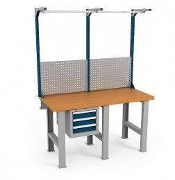 Столешница установлена на три опоры. Верстак укомплектован подвесной тумбой ВС-003. Тумба имеет 3 выдвижных ящика, которые закрываются на один общий центральный замок EURO-LOCKS (Германия), секретностью 2000 комбинаций. Ящики оборудованны системой антиопрокидывания, которая не позволяет открыть два ящика одновременно. Максимальная нагрузка на один ящик - 50 кг