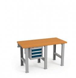 Столешница установлена на три опоры. Верстак укомплектован подвесной тумбой ВС-003. Тумба имеет 3 выдвижных ящика, которые закрываются на один общий центральный замок EURO-LOCKS (Германия), секретностью 2000 комбинаций. Ящики оборудованны системой антиопрокидывания, которая не позволяет открыть два ящика одновременно. Максимальная нагрузка на один ящик - 50 кг