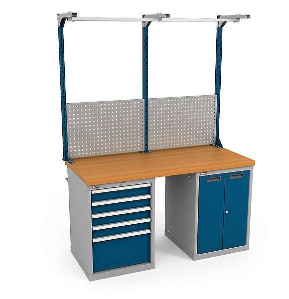 Верстак окрашен эпоксидной порошковой краской, устойчивой к механическим воздействиям и агрессивным жидкостям. Опоры, корпусы Тумб, Экраны и Аксессуары — серые RAL 7038, ящики и дверцы Тумб, стойки экранов — темно-синие RAL 250 20 20.
