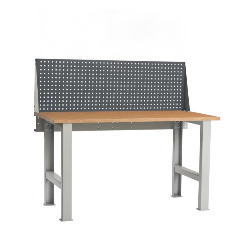Столешница установлена на опоры. На верстак установлен перфорированный экран. На экран с помощью зацепов навешиваются аксессуары. Шаг перфорации экрана 35 мм.