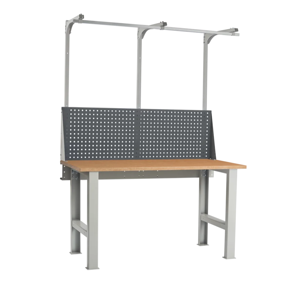 Столешница установлена на опоры. Верстак укомплектован перфорированным экраном и консолью. На экран с помощью зацепов можно установить аксессуары. На консоль устанавливается освещение или бегунок. Освещение состоит из энергосберегающего светодиодного светильника, который обеспечивает 1200 Lx на рабочей поверхности. Шаг перфорации экрана 35 мм.