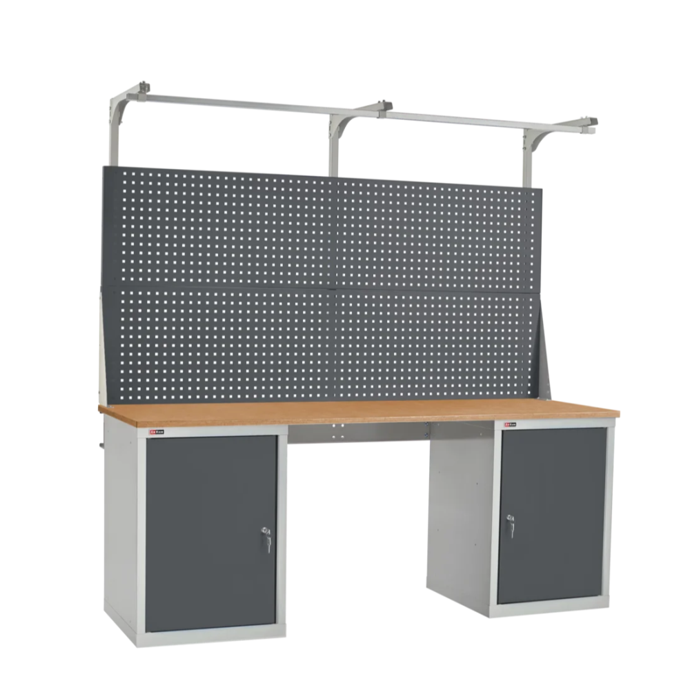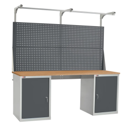 Верстак укомплектован перфорированным экраном и консолью. На экран с помощью зацепов можно установить аксессуары. На консоль устанавливается освещение или бегунок. Освещение состоит из энергосберегающего светодиодного светильника, который обеспечивает 1200 Lx на рабочей поверхности. Шаг перфорации экрана 35 мм.