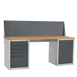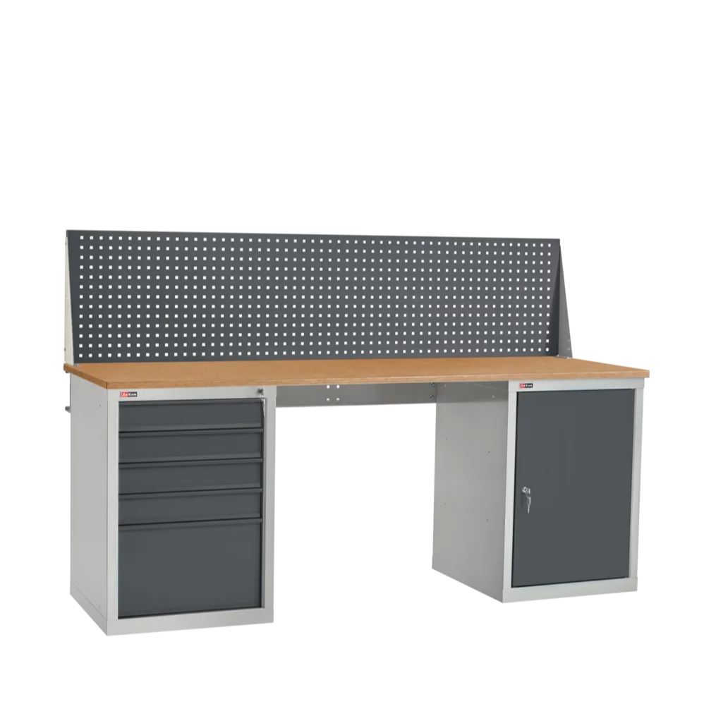Столешница установлена на инструментальную тумбу ВЛ-015 и инструментальную тумбу ВЛ-010. Тумба ВЛ-015 имеет 5 выдвижных ящиков, запирающихся на единый замок EURO-LOCKS (Германия). Тумба ВЛ-010 укомплектована 2 полками и распашной дверцей с замком EURO-LOCKS (Германия).